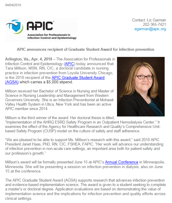 Please congratulate Heather Bernard for having her paper "Creation of a Competency- Based Professional Development Program for Infection Preventionists Guided by the APIC Competency Steps in the Process" published in the American Journal of Infection Control.