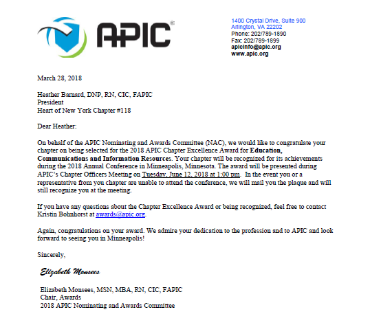 APIC Chapter 118 was selected for the 2018 APIC Chapter Excellence Award for Education, Communications and Information Resources.