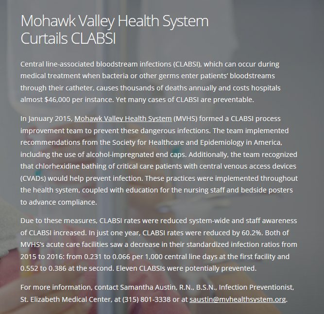 Samantha Austin BSN, RN, CIC, chapter secretary and infection preventionist at MVHS, has had an abstract accepted for poster display at the national conference for the Association for Vascular Access (AVA)! Samantha's abstract is titled Combating CLABSI: The Road to Zero, and will be on display during the conference in Columbus, OH, September 15-18, 2018.