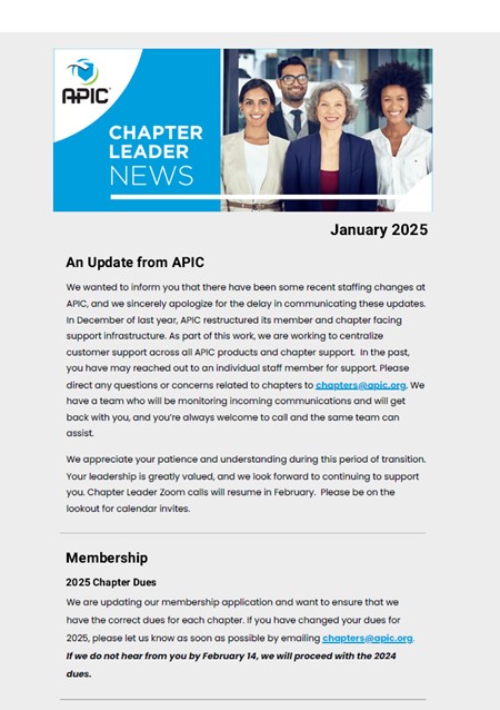 The Chapter Leader News (CLN) is a monthly electronic newsletter that offers helpful leadership information and practical guidance to chapter leaders in various areas of chapter management. Each edition of Chapter Leader News will be archived and accessible here for one year. If there is a specific edition you’re interested in that is no longer available on this page, submit a request to chapters@apic.org. Have an article idea, chapter story, or photo to submit? Send them here.