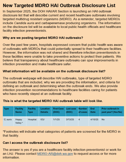 For those located in WA, please see the image below regarding an announcement by WA DOH HAI/AR Section on a new targeted MDRO HAI outbreak disclosure list. Click on the image to enlarge.