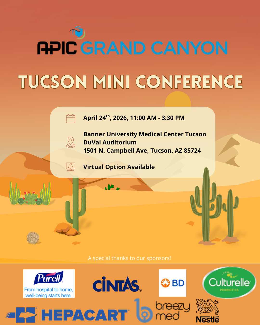 We’re excited to head down to Tucson for our APIC Grand Canyon Mini Conference! We hope you can make it—whether you’re local or planning a fun road‑trip to Tucson, we’d love to see you there—and feel free to invite friends, coworkers, or anyone interested in infection prevention to join us!