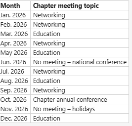 Chapter meetings are virtual on the 2nd Wednesday of the month usually at 3pm MT. Active chapter members will receive an email calendar invitation to link to the meeting.