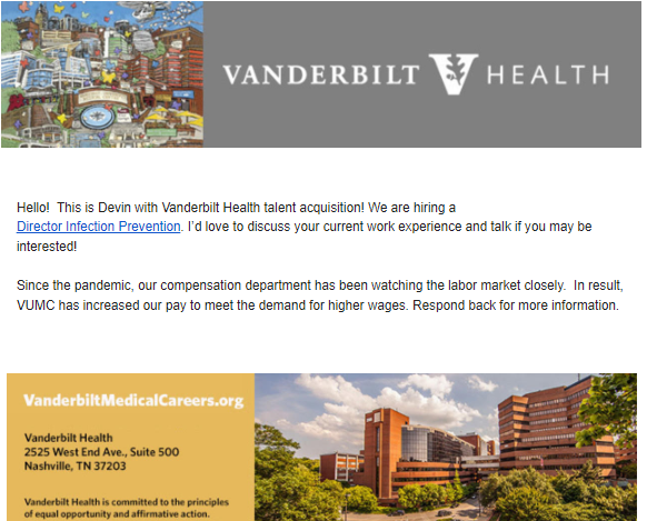 The Vanderbilt recruiter gave me permission to forward information in his email. Please see below if you are interested in the Director of Infection Control position.