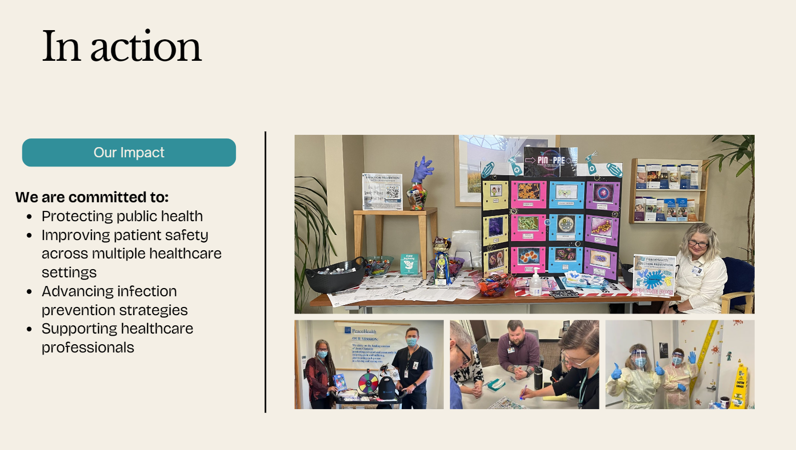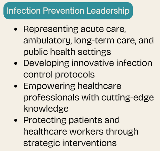 Our purpose is to influence, support and improve the quality and safety of healthcare through the practice and management of infection prevention and the application of epidemiologic principles in ALL healthcare settings.