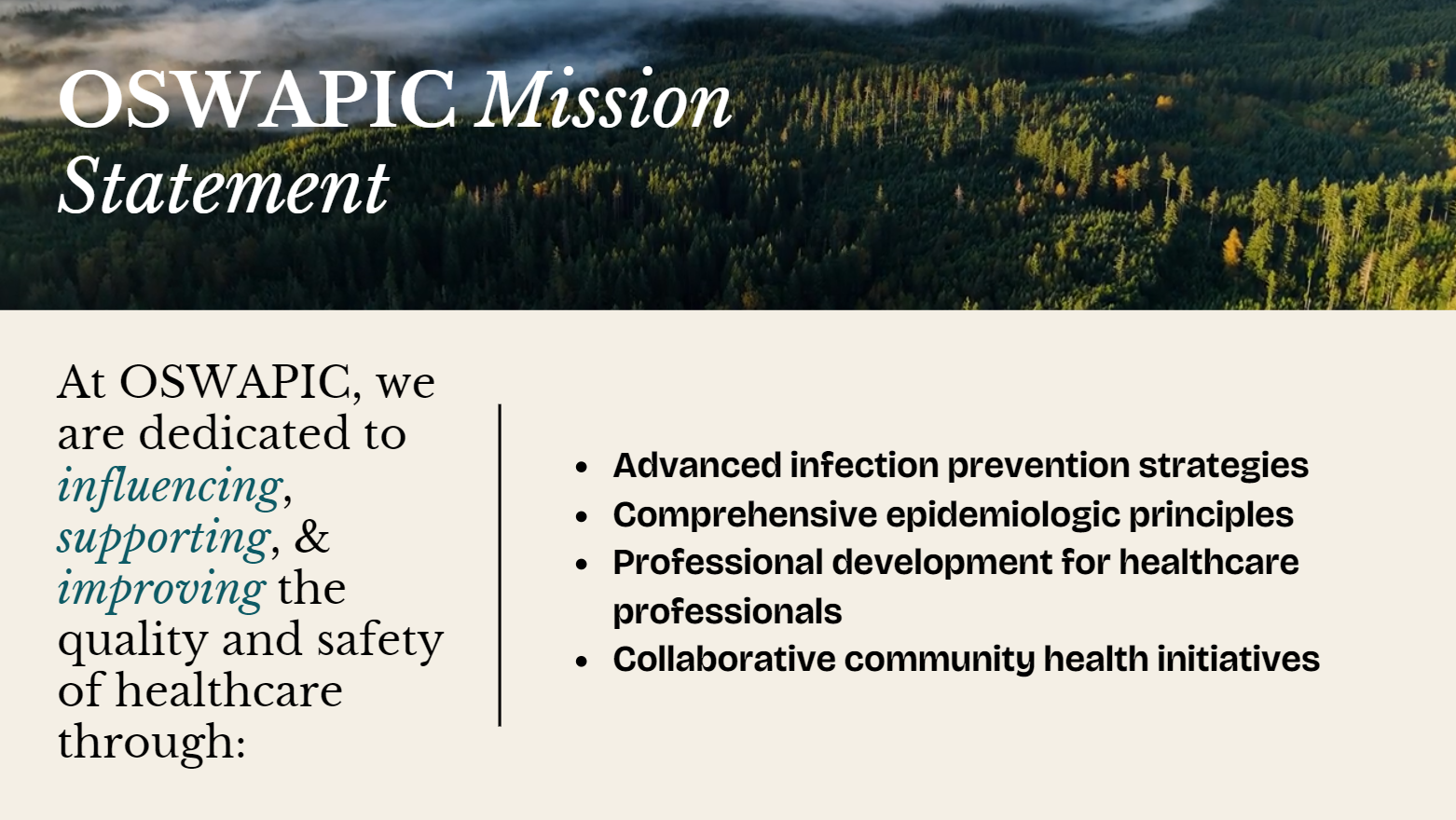The Oregon & Southern Washington APIC (OSWAPIC) chapter was formed in 1977, and registered as a 501(c)(3) non-profit organization. Through the years, the chapter has grown to encompass all of Oregon and part of Southern Washington State.