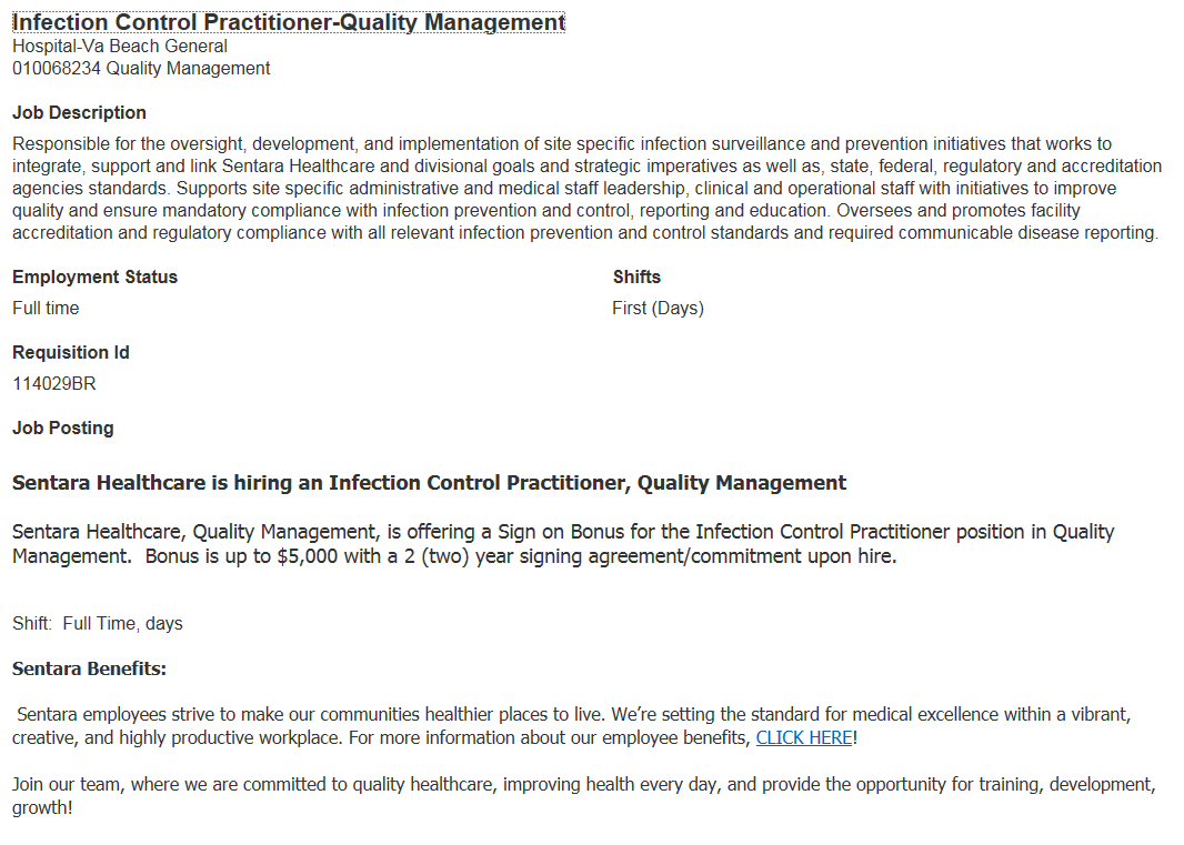 Job Opportunity: Sentara Virginia Beach Infection Prevention & Control